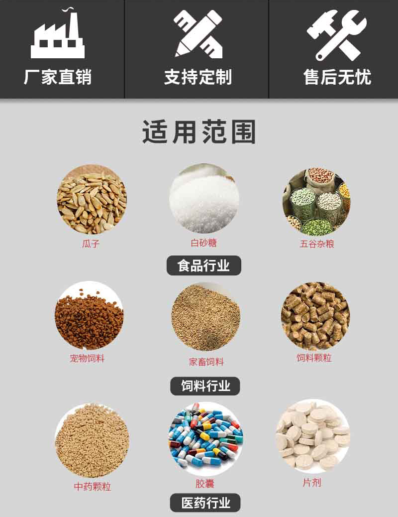 【物料要求】:顆粒度物料,如食品,化工,建筑類(lèi)物料原料